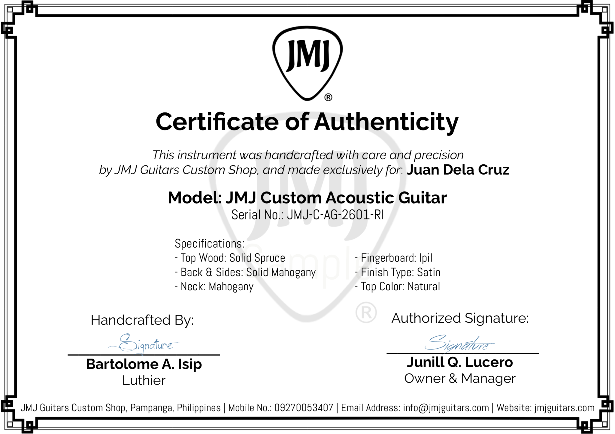 The JMJ Guitars Certificate of Authenticity is a personalized document issued exclusively for our Custom-Built Guitars, ensuring each instrument’s genuine craftsmanship, detailed specifications, and verified ownership.