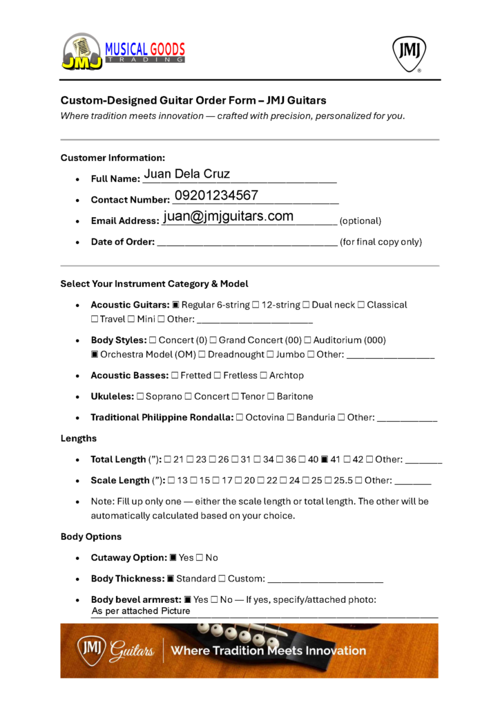 - Submit your completed form to our Facebook page: JMJ Guitars